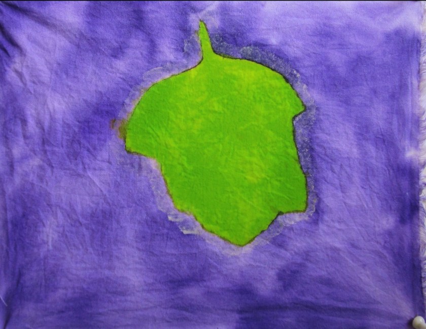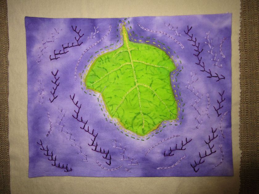 Here is what I came up with using one quilt block made of a circle in a square. I then sewed strips of fabrics around it to cover all of the base and raw edges.