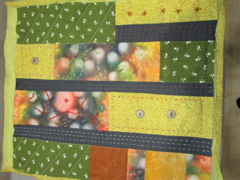I decided to use as many different (beginner) quilting techniques as possible, so that the students could see the possibilities. The image below shows the piece after quilting is done. I used hand quilting and some machine quilting.