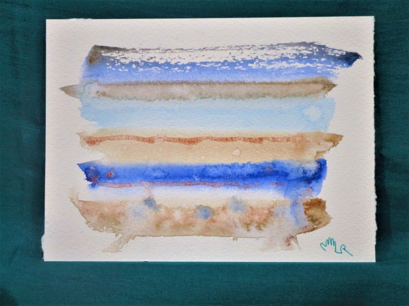 For my last sample, I was inspired by a photograph of the Irish coast. First I penciled a few lines on the paper to guide my color into the shapes of sky, water, sand and rocks. Then came the paint, followed by the sprinkle of water.