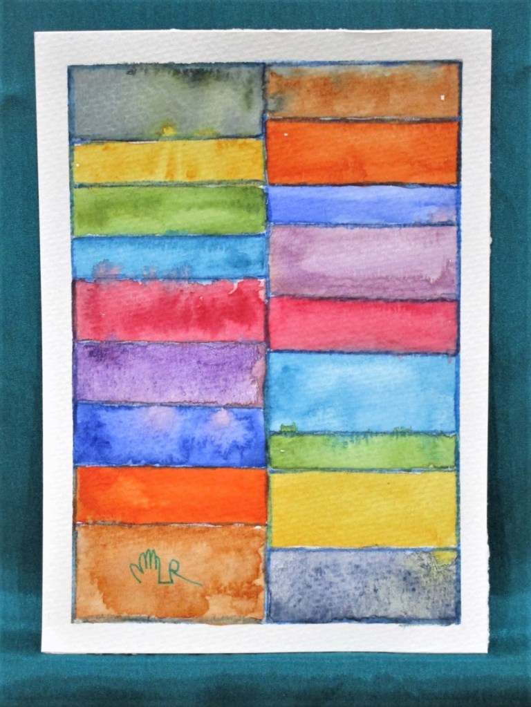 It’s an exercise from Kateri Ewing’s book Watercolor is for Everyone. After drawing two columns of randomly sized rectangles, the artist applies selected colors, reversing the order of application in the second column.