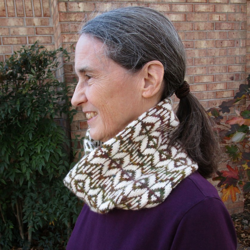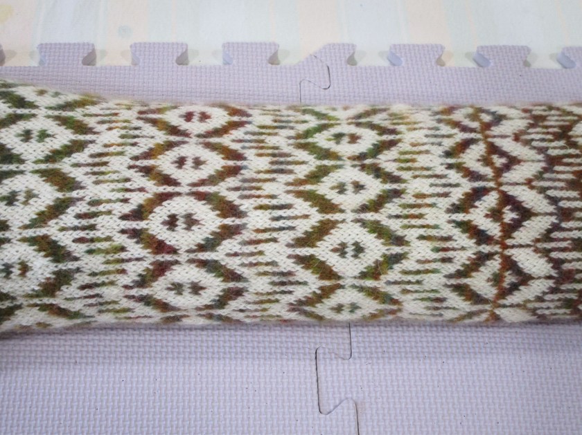 The pattern is Velvet Mirror, a cowl designed by Andrea Mowry. In this image, it is laid out to dry after washing. You can see that the colors used in the stranded design are reversed at the mid-way point.