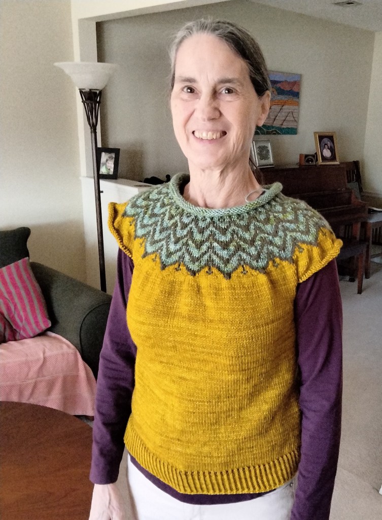 I know, friends, the finished object is enormous. And the intended recipient is narrower than I am. (sigh) Hopefully, she will not mind being swamped. At least the sleeve length looks good.