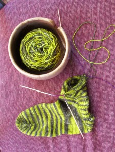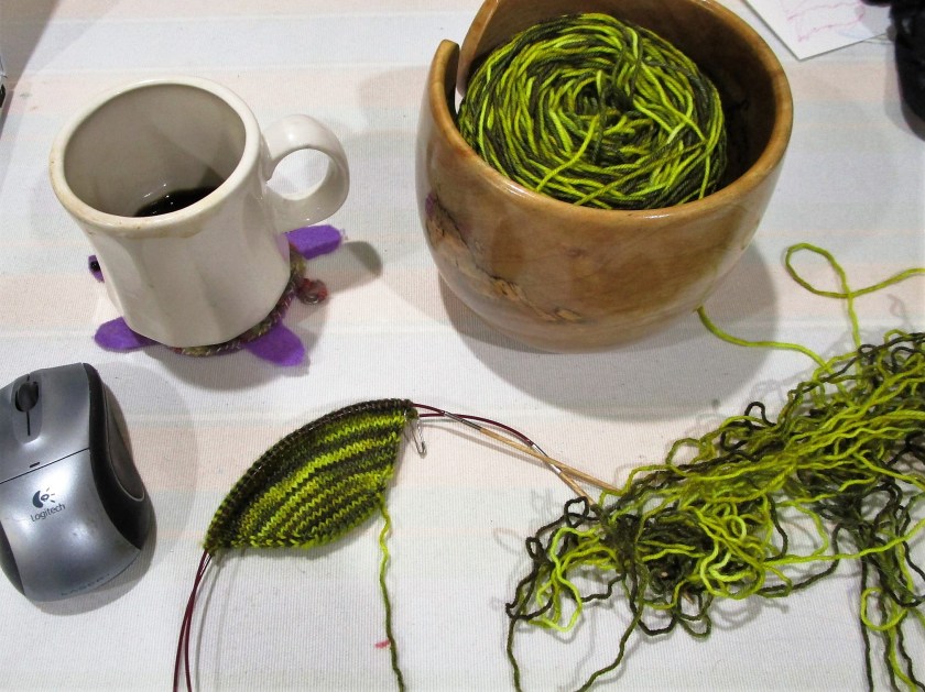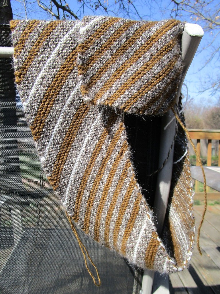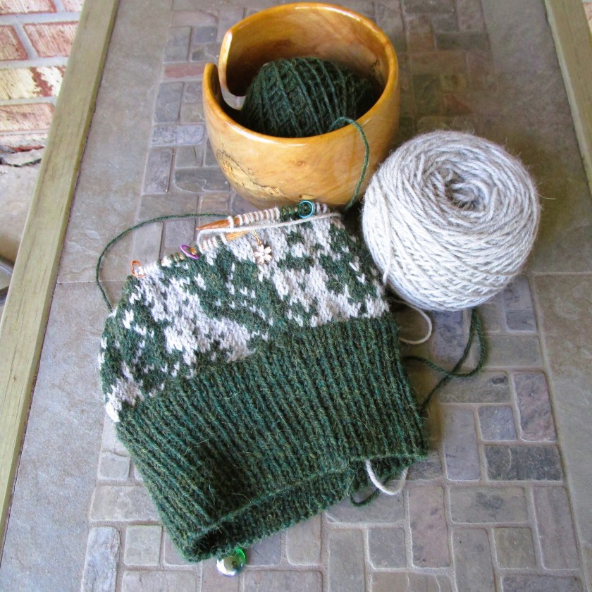 Here I am switching out colors once per row. After practicing on the hat, I hope I will be ready to knit the pull-over.