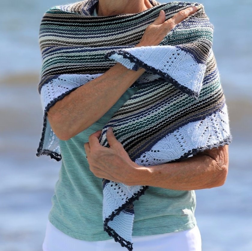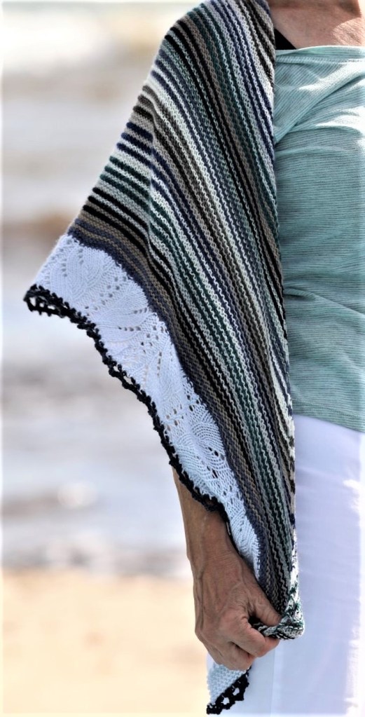 The pattern was easy to follow. Because I didn’t quite get gauge, I cast on extra stitches and followed the instructions for the next larger size. Ultimately, the process of washing and blocking widened out the knitting, but didn’t add any length, which is a good thing. I got the length I was aiming for.