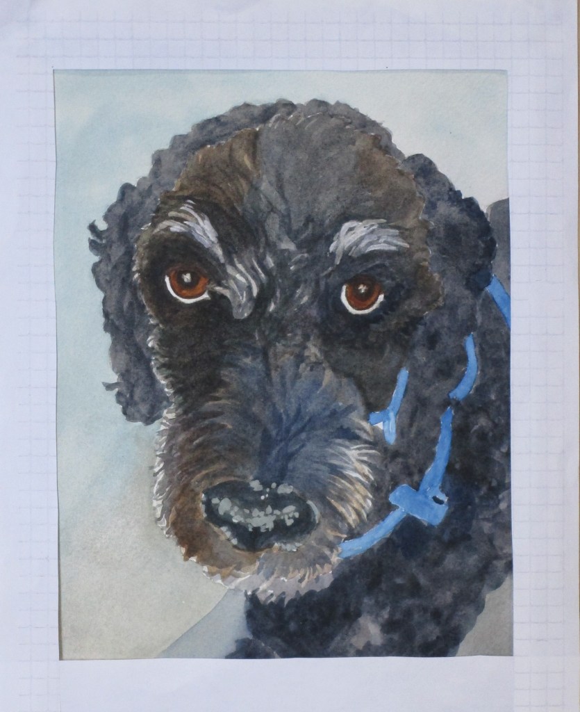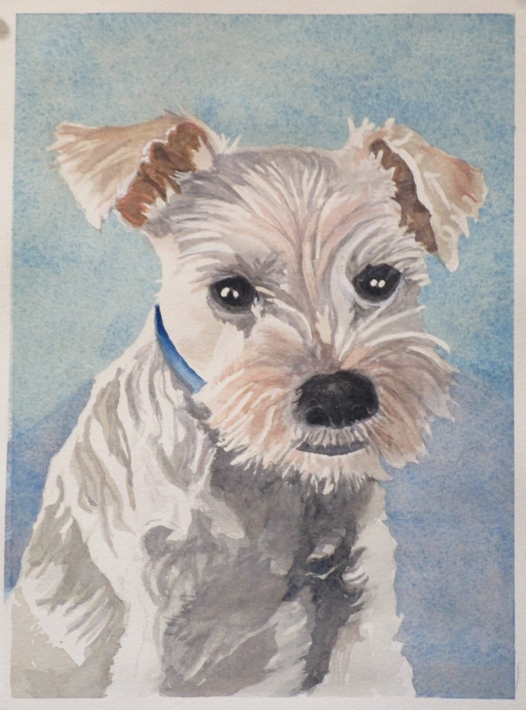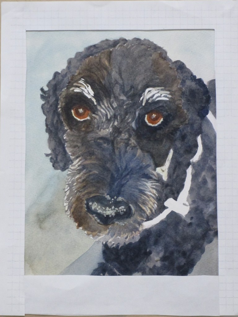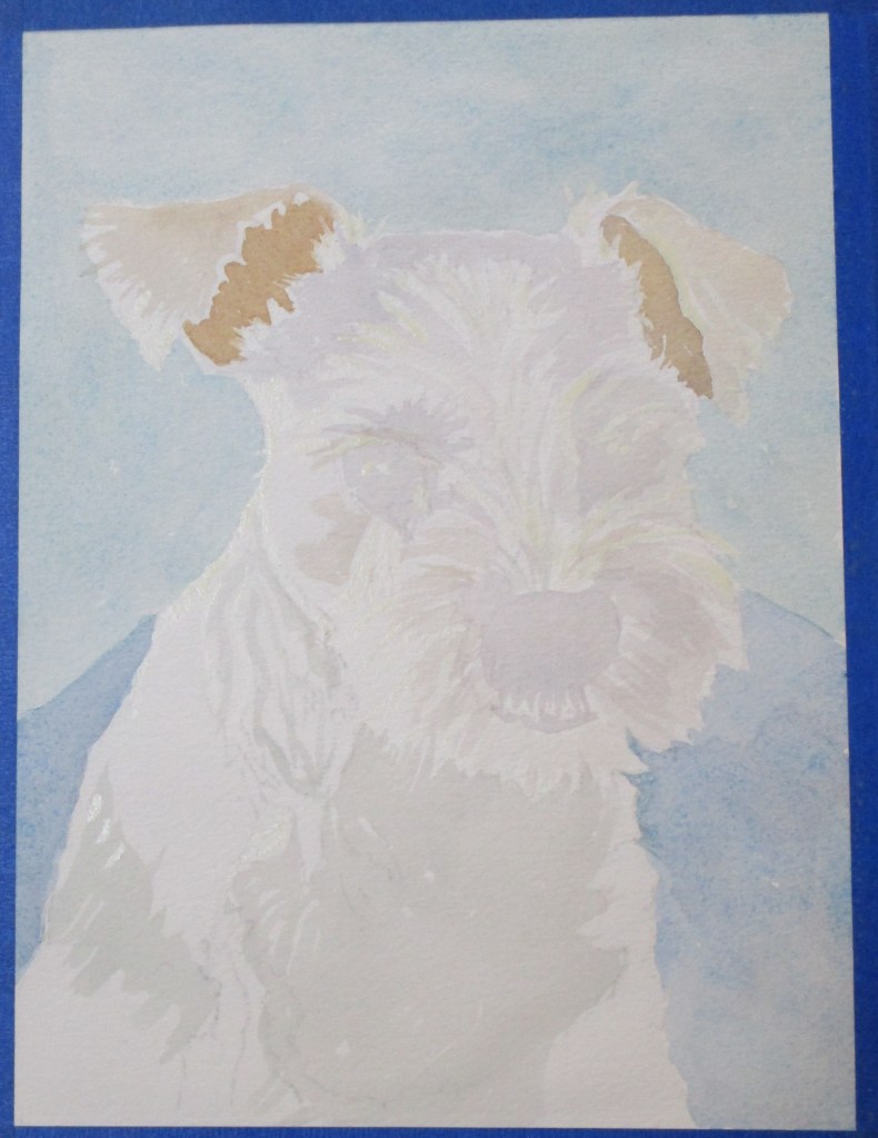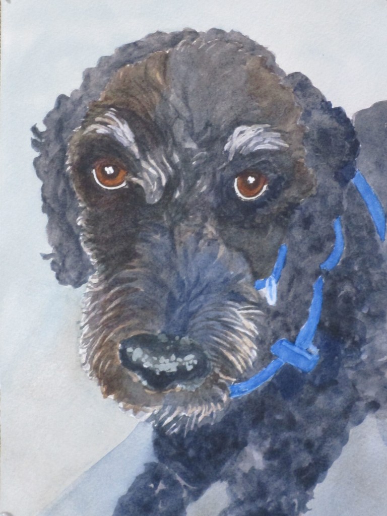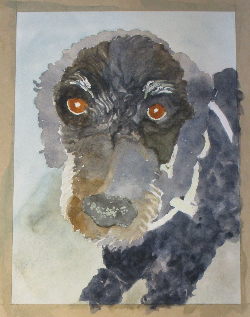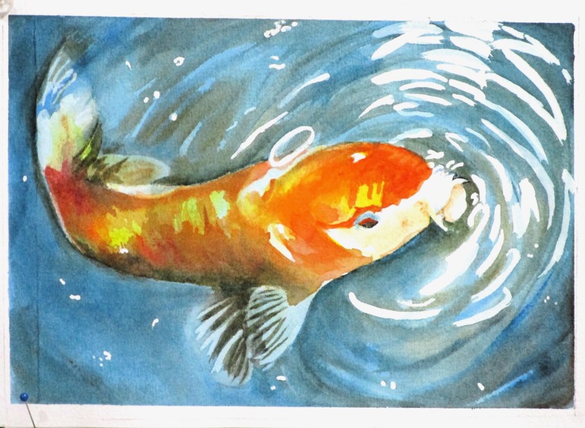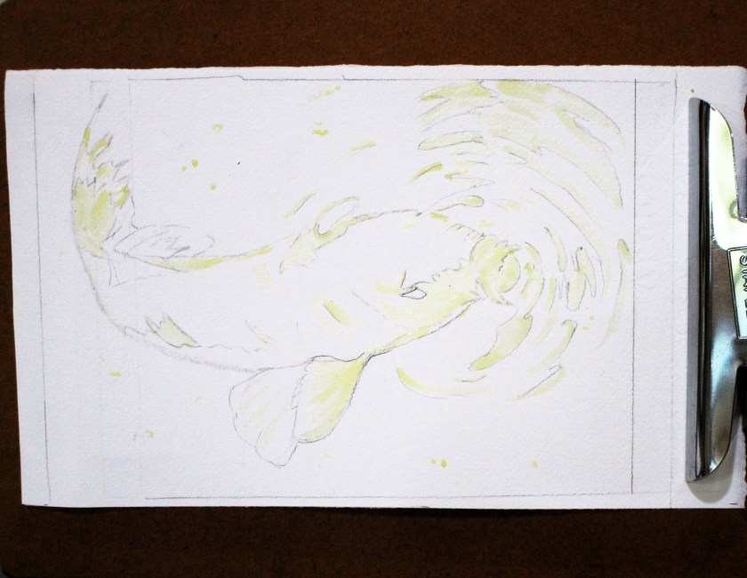 I liberally applied masking fluid with a toothbrush for the wave action, and with a tiny brush for the white shell markings on the turtle. Pigments were yellow ocher, burnt umber, burnt sienna, Winsor Green blue shade, alizarin crimson, ultramarine blue and white gouache. A few Micron pens stipples were added to suggest motion.