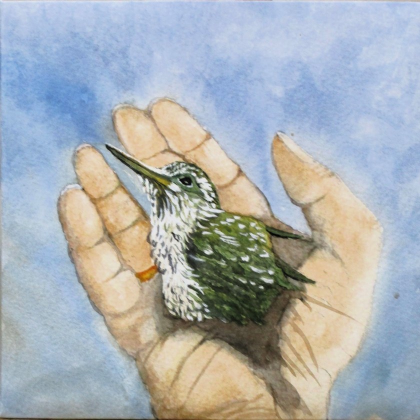 A baby sea turtle, hurtling its little body toward the safety of the sea. This watercolor painting was made as a donation to the 2025 6 by 6 art sale for my local art association. The reference image was found on Unsplash – so many years ago that I lost track of the photographer.