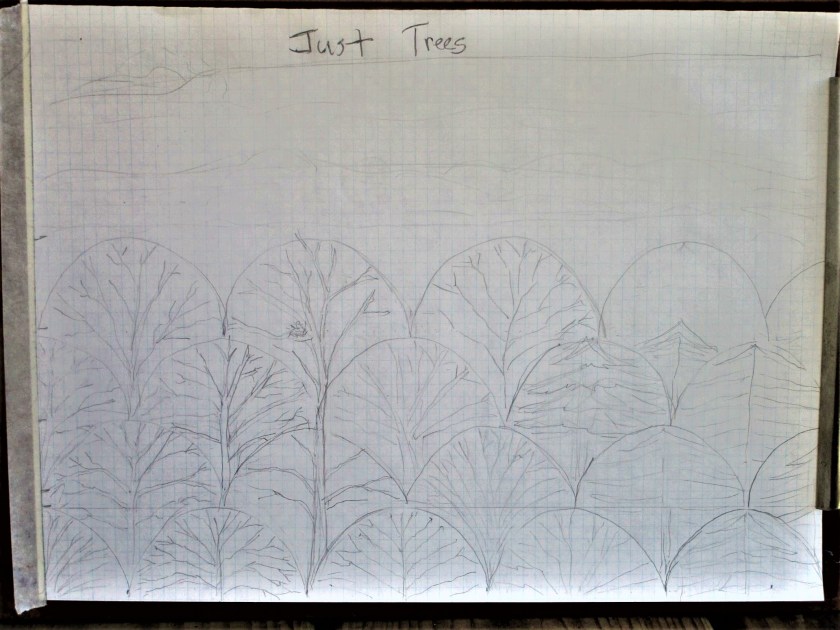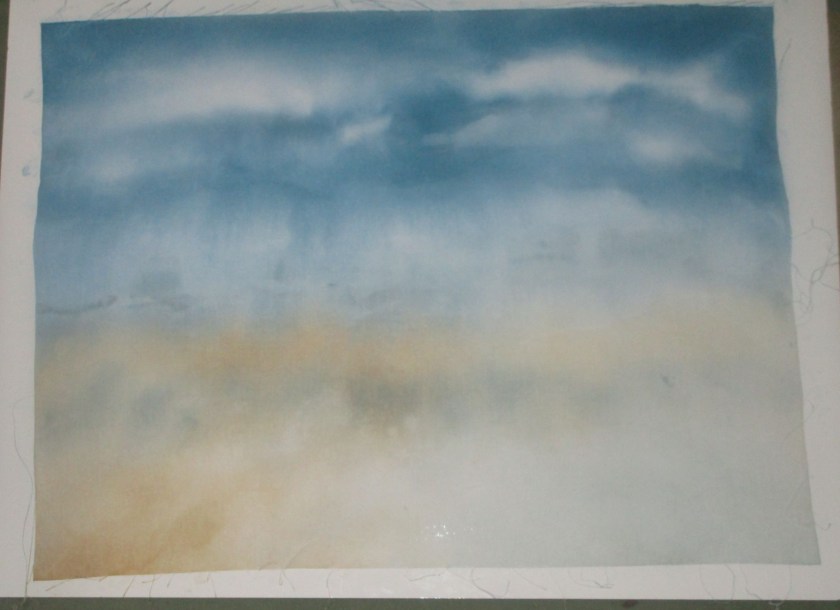 Four colors of paint were applied in bands horizontally across the fabric and allowed to bleed together. When the panel dried, it looked like a mountain scene to me. I enhanced the image with opaque white paint, paint pens and stencils of pine trees.
