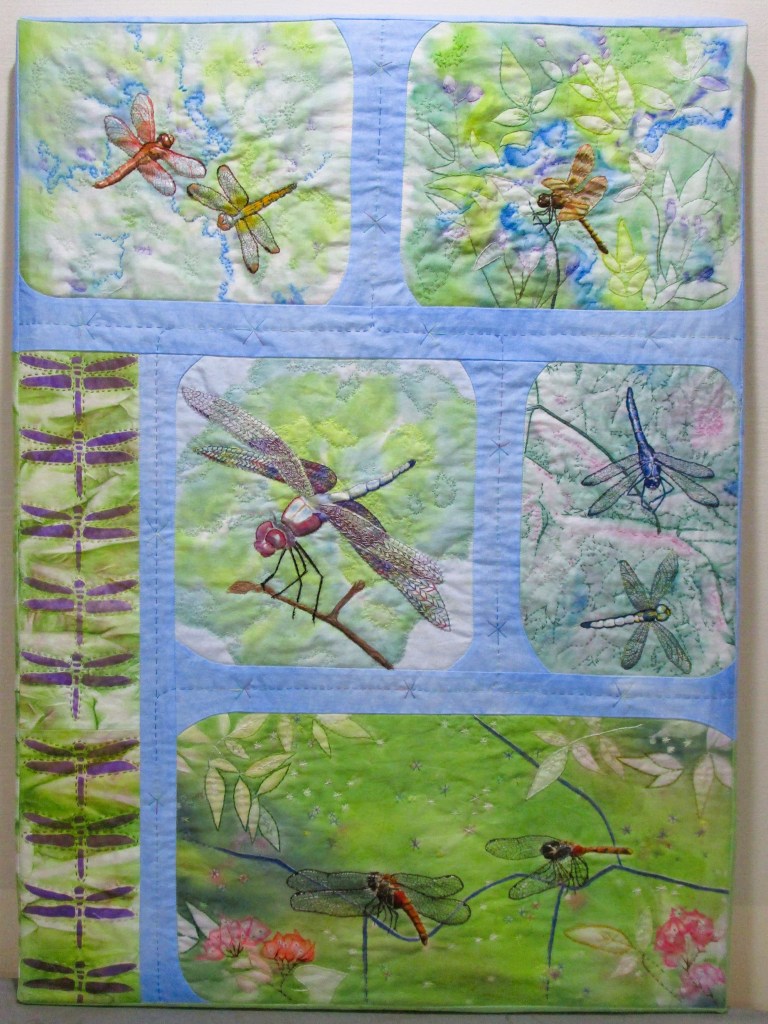 After eighteen months in process, my multi-panel quilt that explores the dragonfly is finally finished. The painting and the assembly of the quilt took place in 2023. Then it languished while I fiddled around with hand embroidery. Finally, I made the commitment in December 2024 to get this WIP done. It took an opportunity to display it at an exhibition to set me in motion.