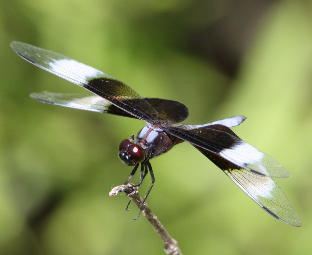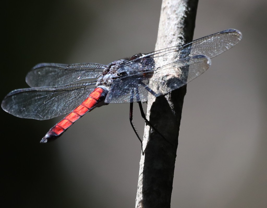 I also did research into the creature, to better understand what I was seeing. I was always puzzled about the legs. In flight, they are not visible. When the insect is perched, one can see either one, two or all three pair of legs. Why is that? I learned that the legs are swiveled back and held flat against the body, just like an airplane’s landing gear. The dragonfly catches its prey in flight, grabbing hold with its legs. When resting, the legs have no function. Dragonflies cannot use their legs to walk. That’s why they seem so motionless when perched.