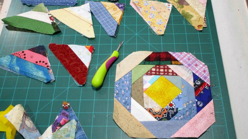 Attaching the strips to the center, cutting back extra.