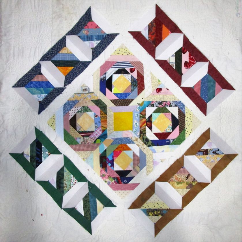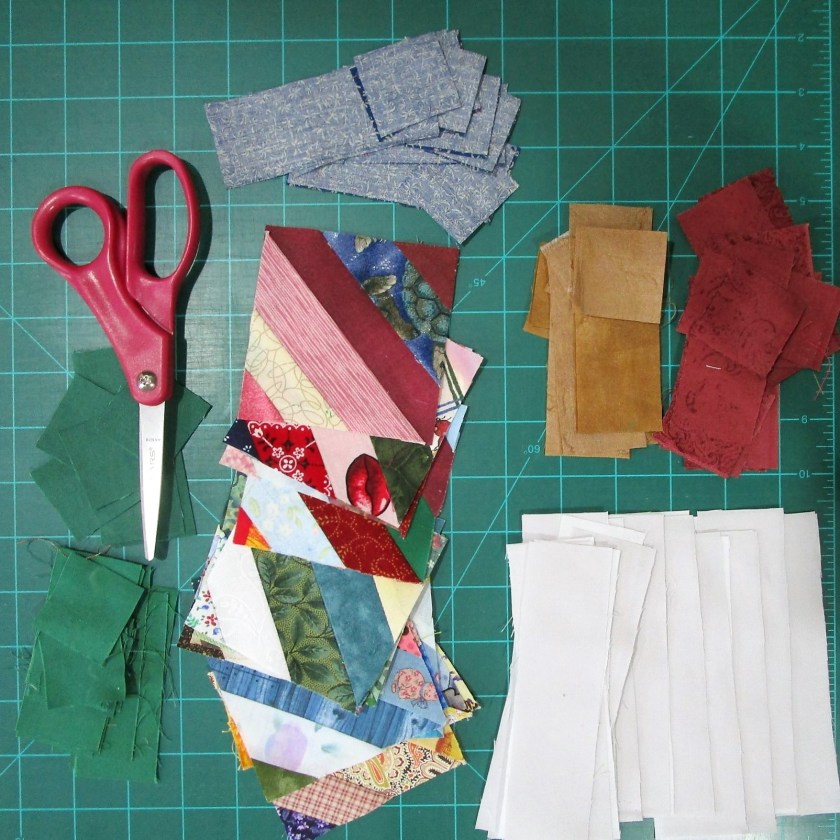 Settling on a pattern of 1-inch squares surrounding a 2-inch center, I pulled all the gray, beige and white fabric left over from my past quilt projects. Next,I sliced them into 1 and 1/2 inch strips, then sewed these together in twos, and fours.