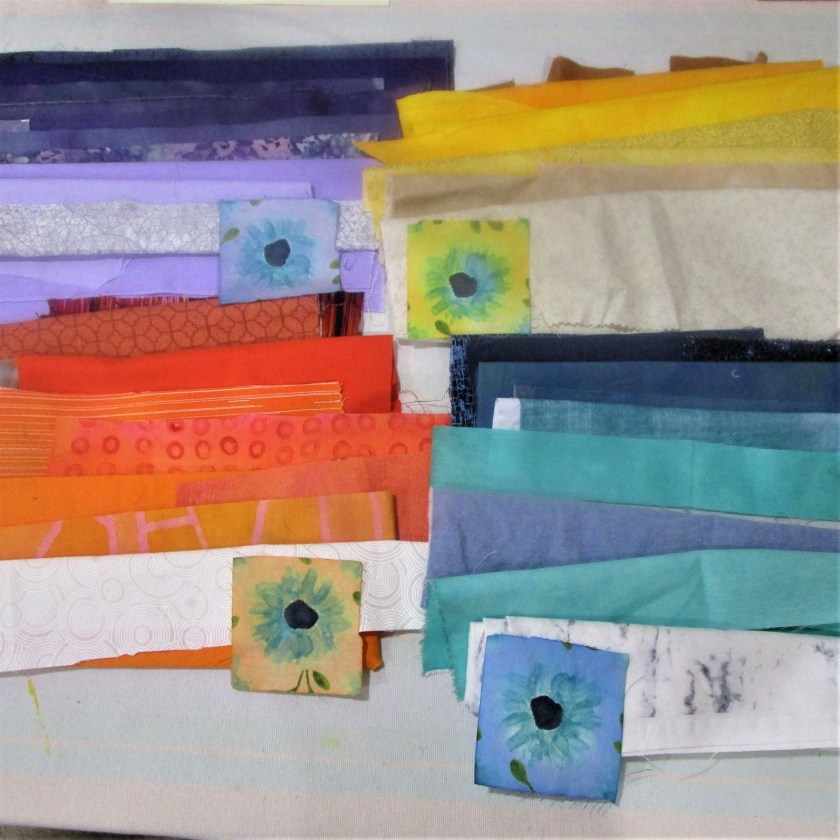 I like this fabric because it has the appearance of a watercolor sketch. I’m going to use these squares as the focal points for some monochromatic log cabin blocks. First I tinted the background with my color choices. Then I gathered matching fabrics in a wide range of values.