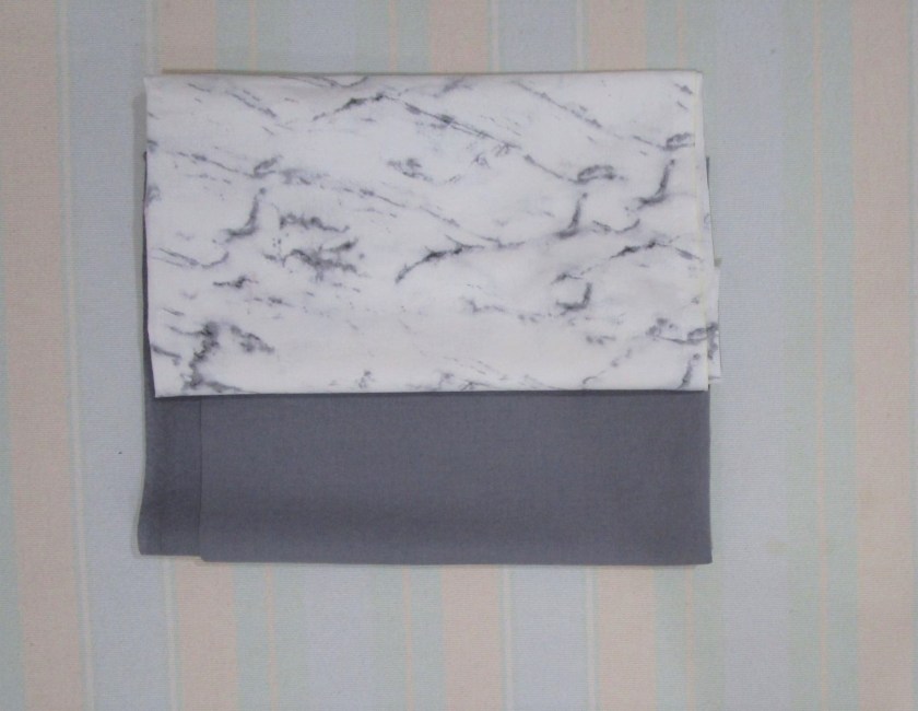 The gray solid will be used for most of the work. I chose the white marbled fabric because the black lines are vaguely cloud-like. Here we go: