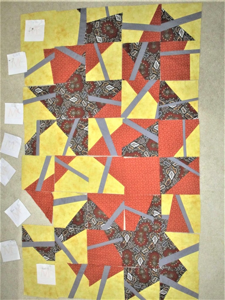 Now the fun begins. Lay out your blocks in rows. Move them around, arranging the blocks until they look “pleasing to you.” Lacking a design wall, I laid mine on the floor.