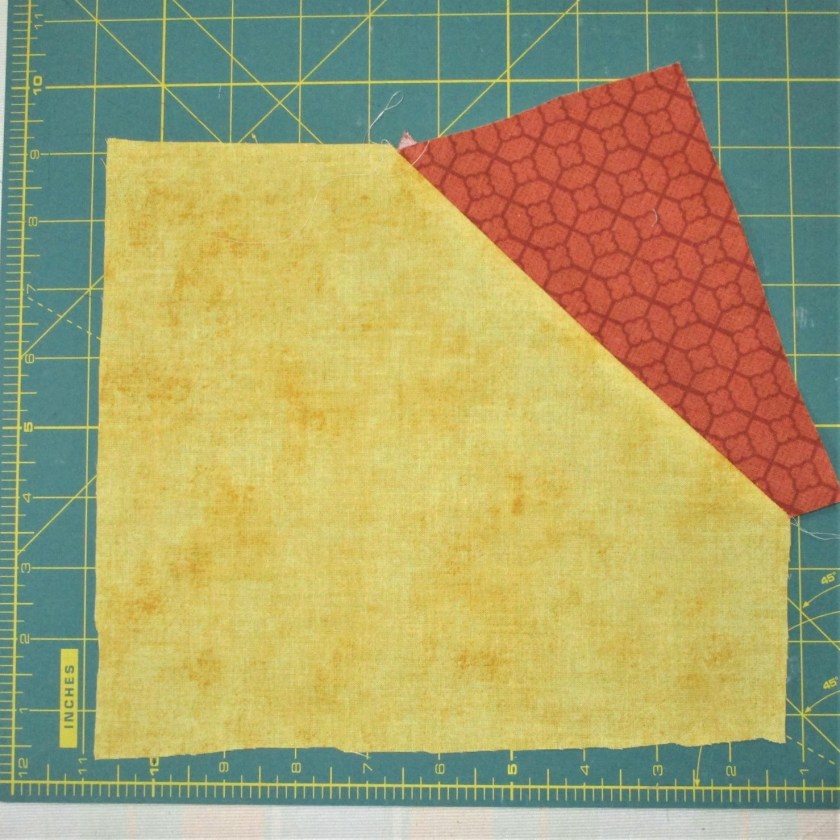 Step 4: Cut out a triangle from one of the other fabrics. Sew it to the square at the cut edge.