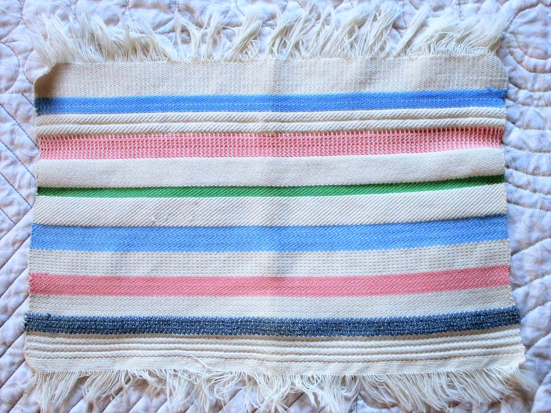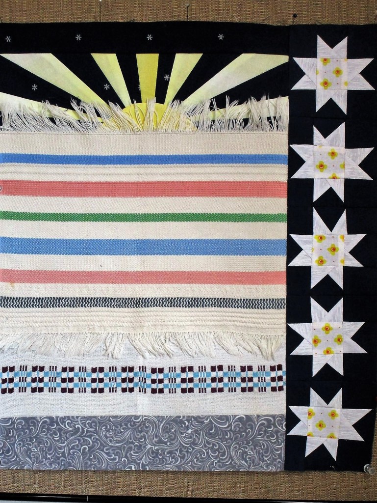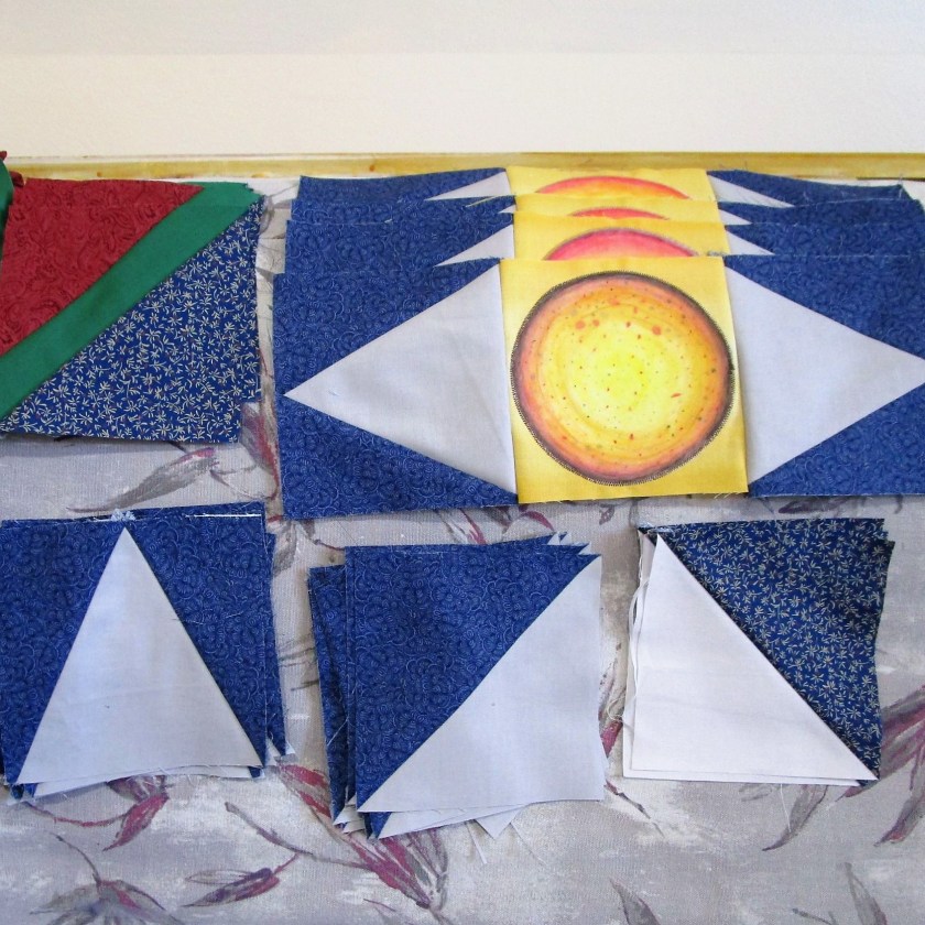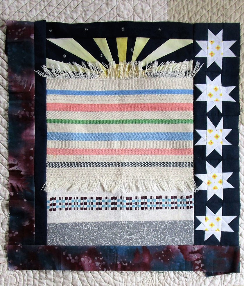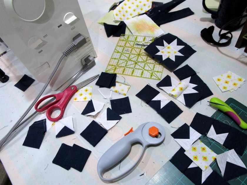 They are all types. There’s smooth cotton and homespun, shiny metallics and quiet two-color prints. What I forgot to buy was fabric in light colors. So my completed squares are about to get darker.