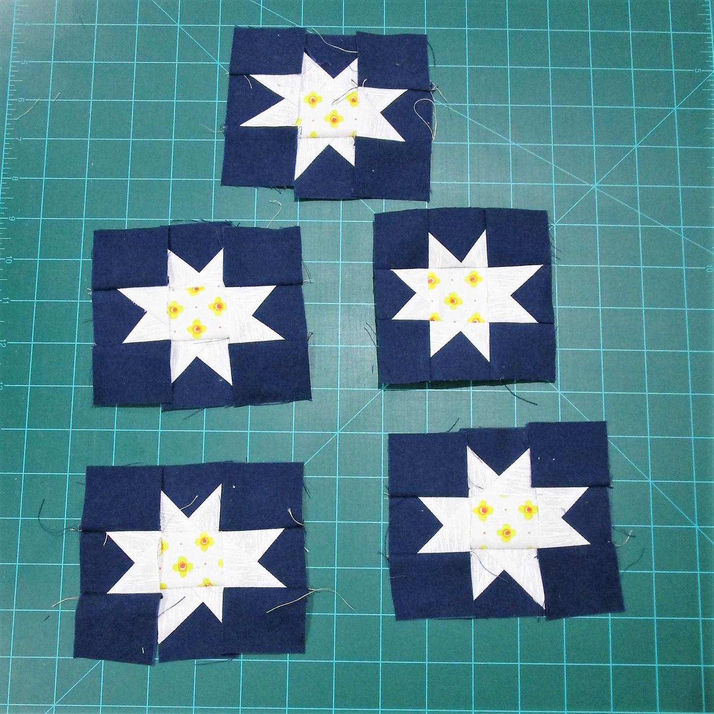 I will be continuing to stagger the placement of blocks. That means I need to wait for Round 4 to finish this row. Two blocks from Round 4 will replace the outside stars in this row. They will be moved to row 4.