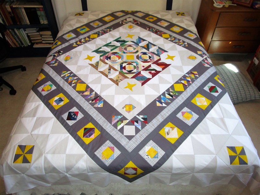This Friday, I have a final view of my Stay-at-Home Round Robin quilt. While I am describing it as a finish, there are several more steps I need to take before it can grace a queen-size bed. But, all the design elements are in place.