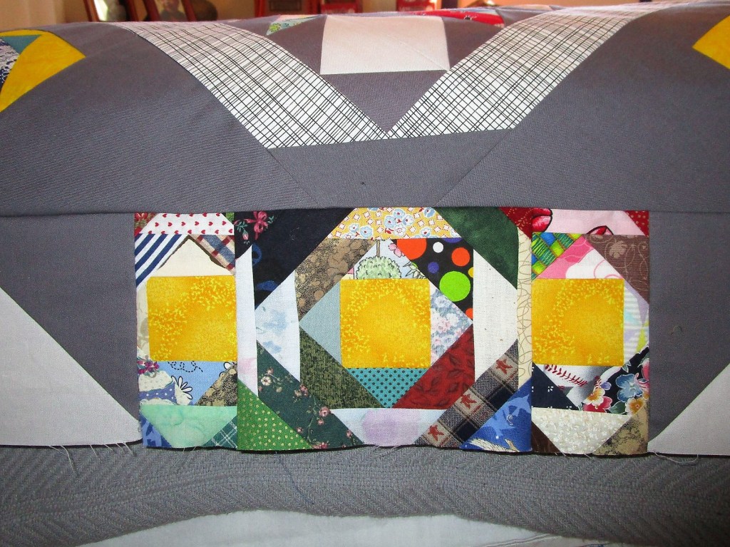 After sewing the corner pieces in place, the quilt still needed more width. To address this, I made strips of half-square triangles. At the centers of these strips I inserted a few more scraps from my recycled pineapple blocks, just to break up the long stretch of background fabric.