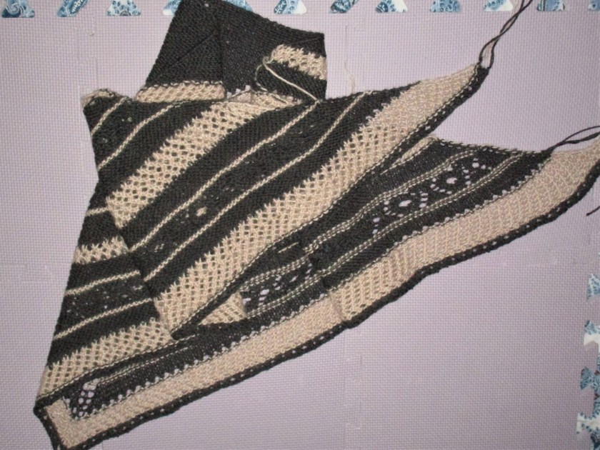After months of fiddling around with the luxury blend, coal colored yarn my daughter gave me, I finally settled into a shawl design. Fellow blogger Deb Gemmell has unvented an improvement to the basic triangle shawl which she calls Wedges Shawl. Her goal is to increase the length of the shawl ends without making the body section excessively long. You can read about it on her blog: https://wordpress.com/read/blogs/135503248/posts/1913
