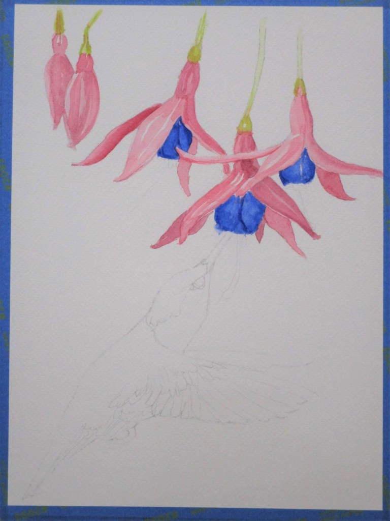 Back then, I sketched a picture that was a composite of two photographs: A group of fuchsia blossoms and a hummingbird.