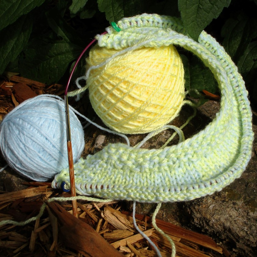 It’s cast-on Monday. Having finished my latest knit project, I am ready to continue the stash reduction campaign by starting something new. The acrylic section of the stash is pretty well depleted since I finished up the Abstract Rainbow lap blanket. Left behind is a giant ball of yellow sport-weight yarn, intended for a baby blanket I suppose. I was given it along with a few bits and pieces of pale blue and pale variegated yarns. The pale yellow doesn’t inspire me.