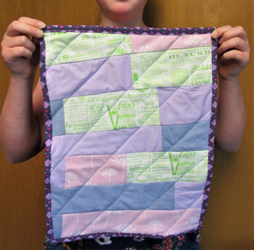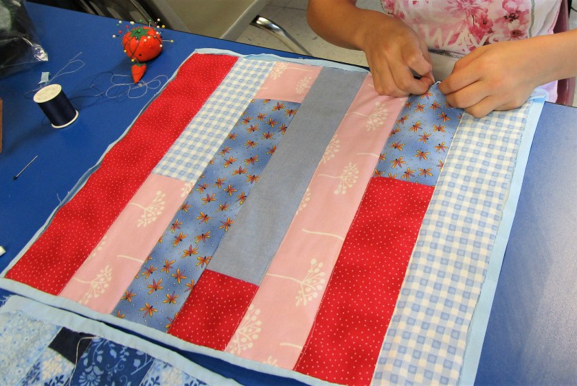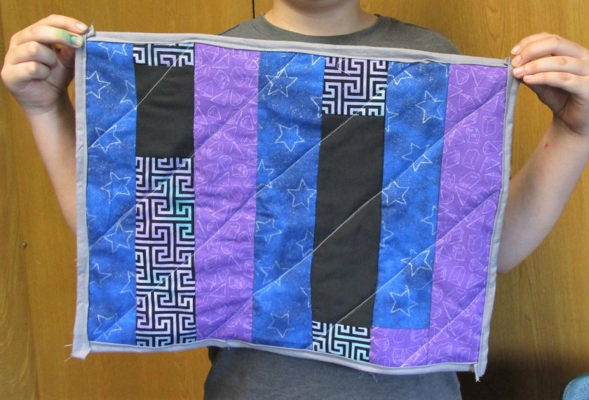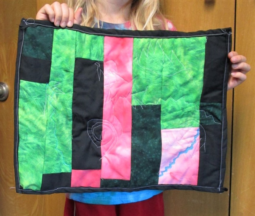 Today my fiber arts students finished up classes for the year. I can hardly believe that I taught children a fiber arts project every week for eight months! In the end, I feel that I gained just about as much as I gave. While the students tell me that they learned a lot and had fun, I also learned much about making things with fiber in the process of developing lesson plans. Our last class was the wrap-up on string quilt samplers. The quilt tops made in previous weeks had backings added, were quilted, and bound off. Here are some images at the end of today’s work: