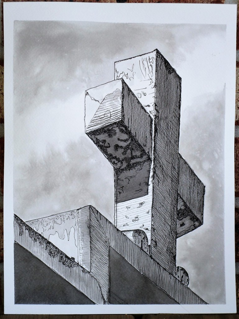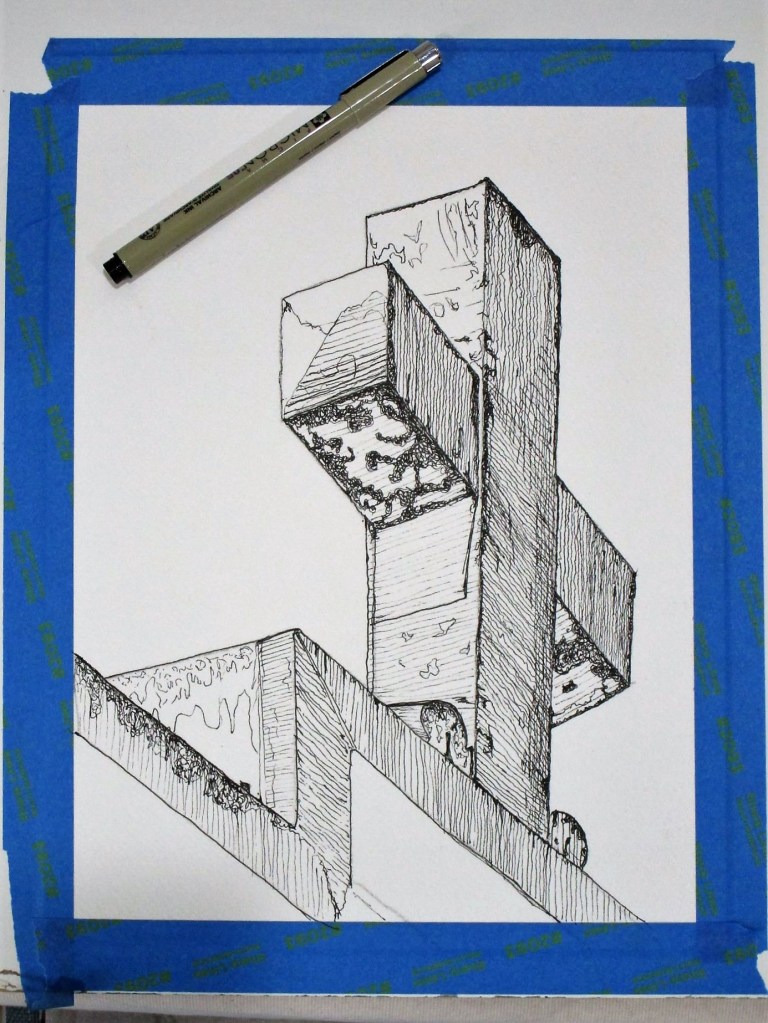 I was drawn to this one by its lines, texture and geometry. To bring those characteristics to the fore, I used pen and ink to render the cross.