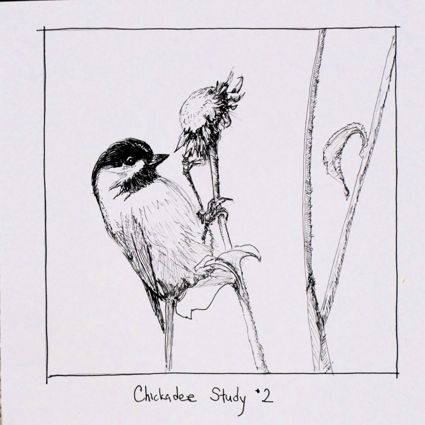 On an 8 by 8 inch piece of paper, the little chickadee, which measures barely 4 inches, can be drawn at its full size. First, I worked out the placement using pencil, then inked the contours lines, adding value with various types of marks. My sweet subjects, black and white IRL, were rendered with ease.