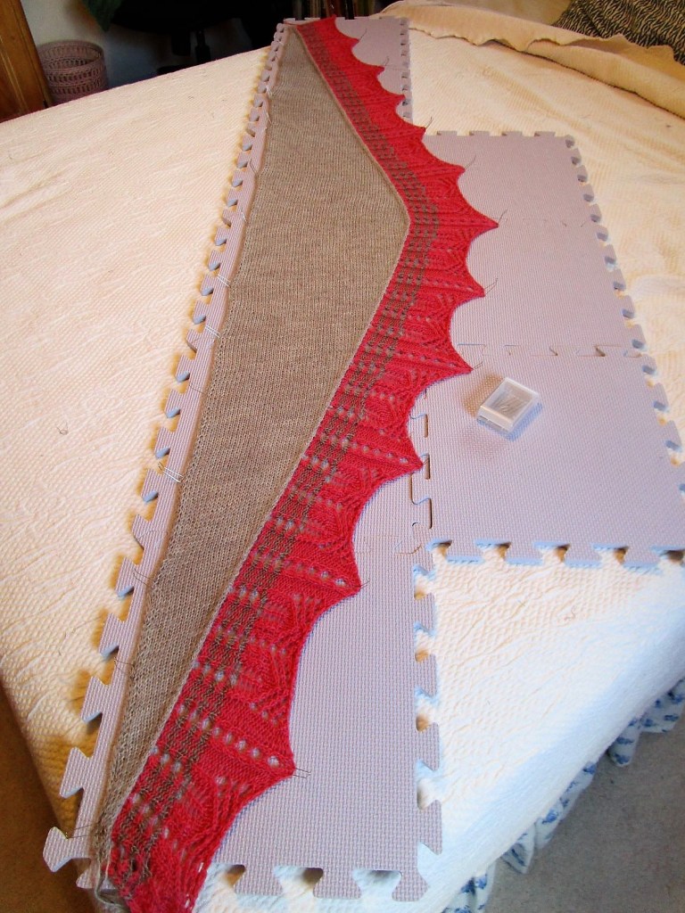 I enjoyed working on this project. It was basic straight knitting and made a good mindless project. It’s easy to pick up stitches along the triangle’s edge – one stitch per garter ridge. And the color play is gratifying to watch.