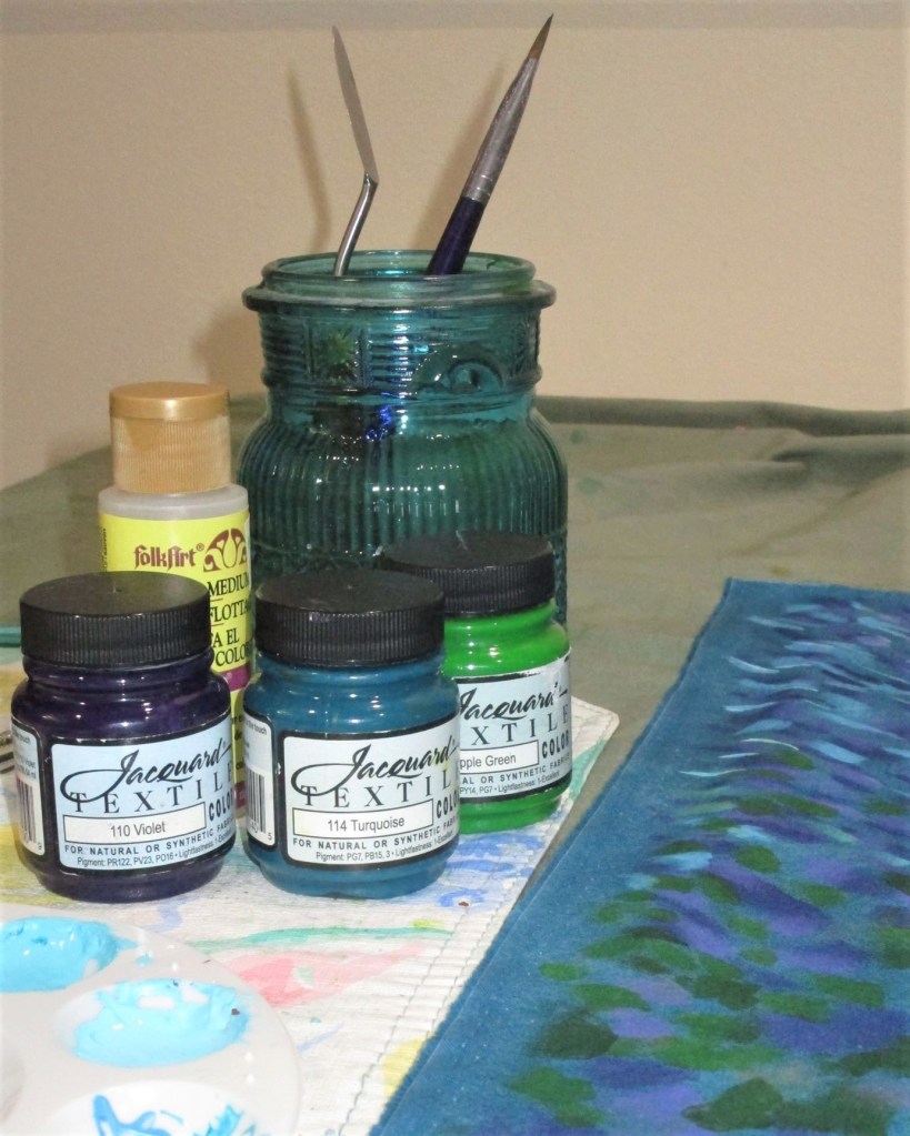 When I reached the sky, I sewed wavy lines around several of the paint dashes and dabs. After finishing the quilting, I bound the quilt on all sides with blue fabric.