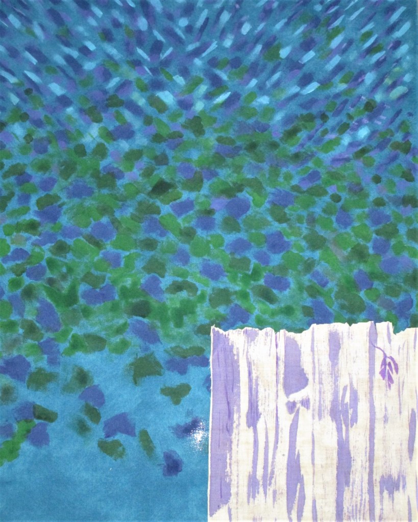 For my final step, I mixed some paint. I painted echo lines, focusing on the upper half of the piece, and giving much attention to the flowers. Then I called it done.