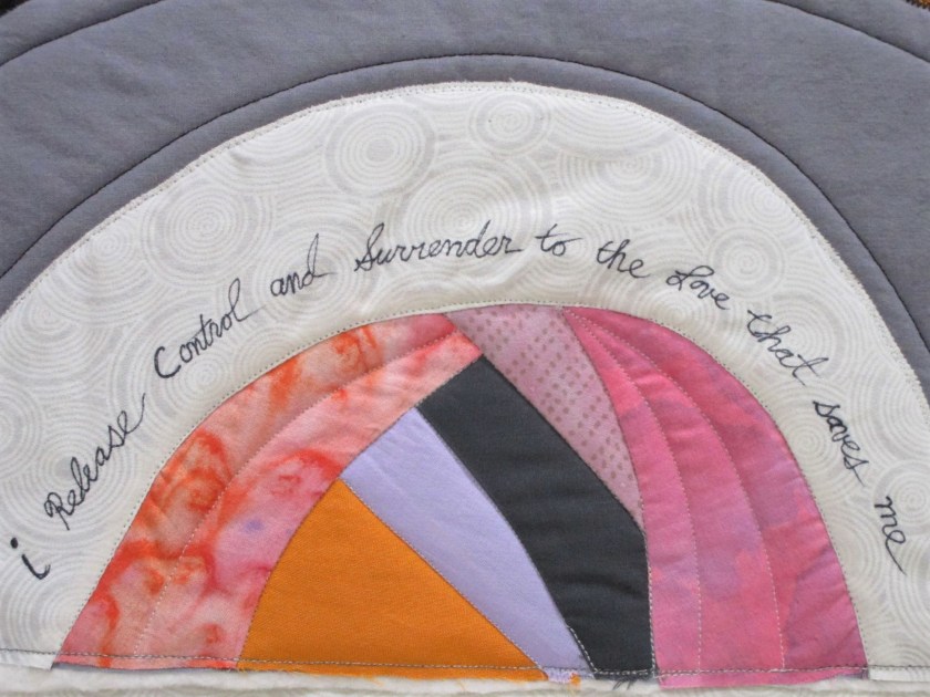 And that is essentially the design of this mini quilt. After glue basting and stitching down the two appliques, I wrote the mantra on the white arch.